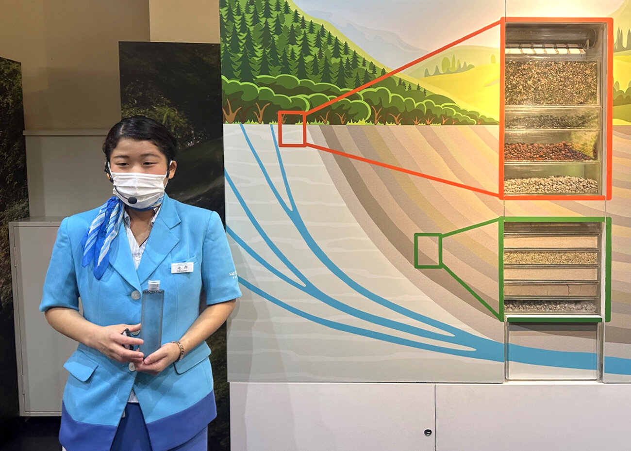 この模型は天然水が出来るまでの流れを表現しています。