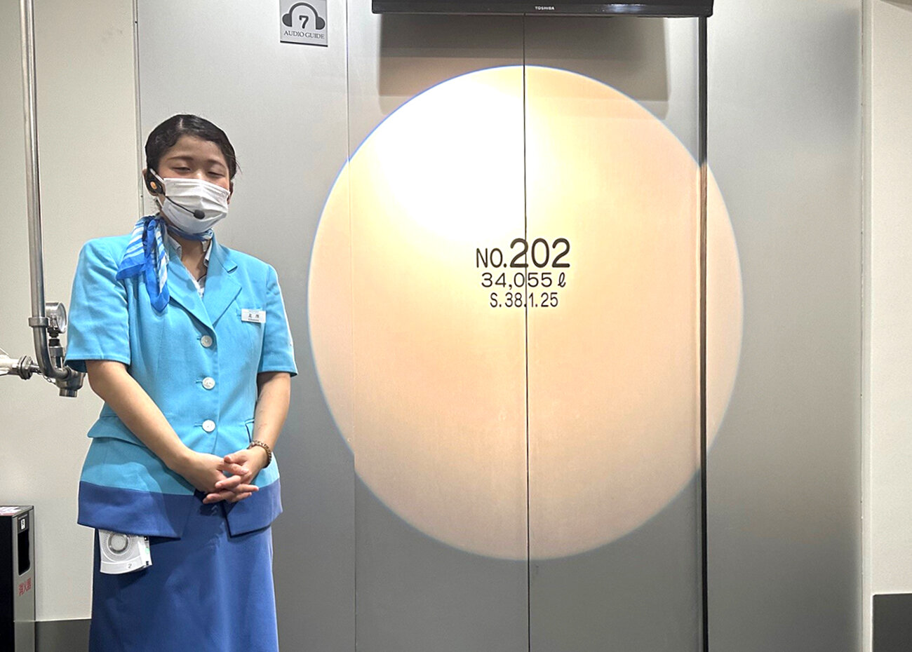 このタンクは昭和38年(1963年)のサントリー〈天然水のビール工場〉東京・武蔵野が開設された当時に実際に使用されていたものなんです。この中には元々34,055lのビールが入っていました。350mlの缶で約97,000本、1日1本飲むと260年もかかる量が入っていたそうです。想像しきれない数ですね。