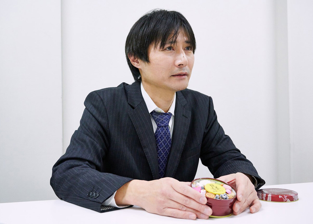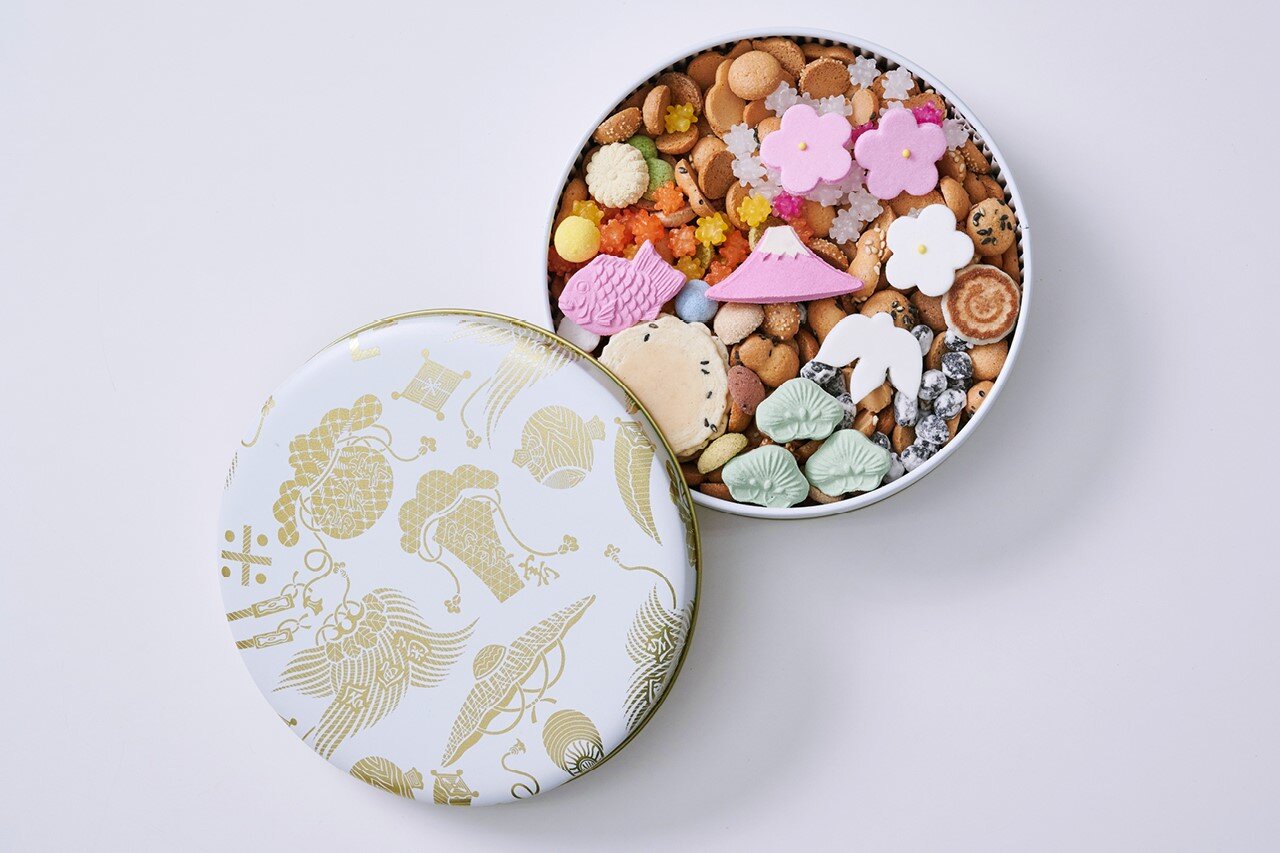井田さん:こちらは創業130周年を記念してお作りした商品で、赤富士や鯛などのおめでたい干菓子や金平糖、バター不使用の和風クッキーなどを白い丸缶にお詰めし、お祝いを意味する「寿ぐ」の名を付けました。