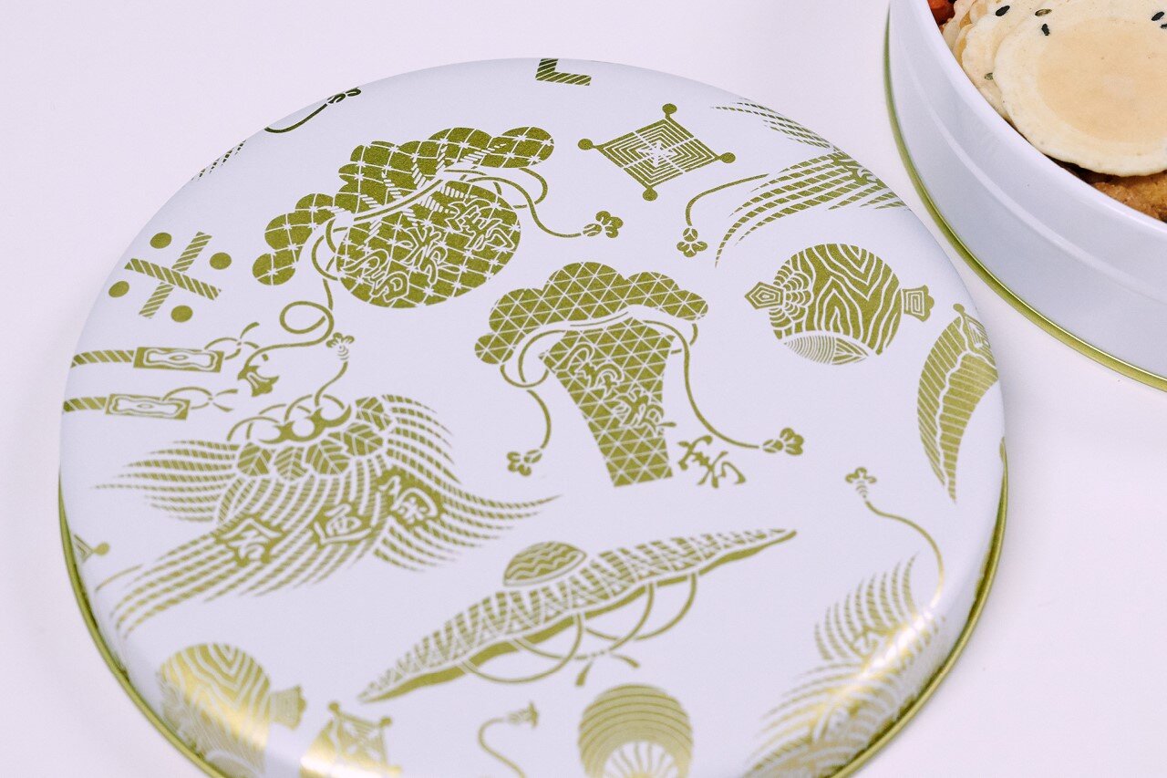 井田さん:この宝づくしの絵柄は三代目が自ら描いたもので、古くからある定番商品の青丸缶と赤丸缶にも描かれています。今回、紅白が揃うのも縁起がいいということで、缶の色は白にしました。