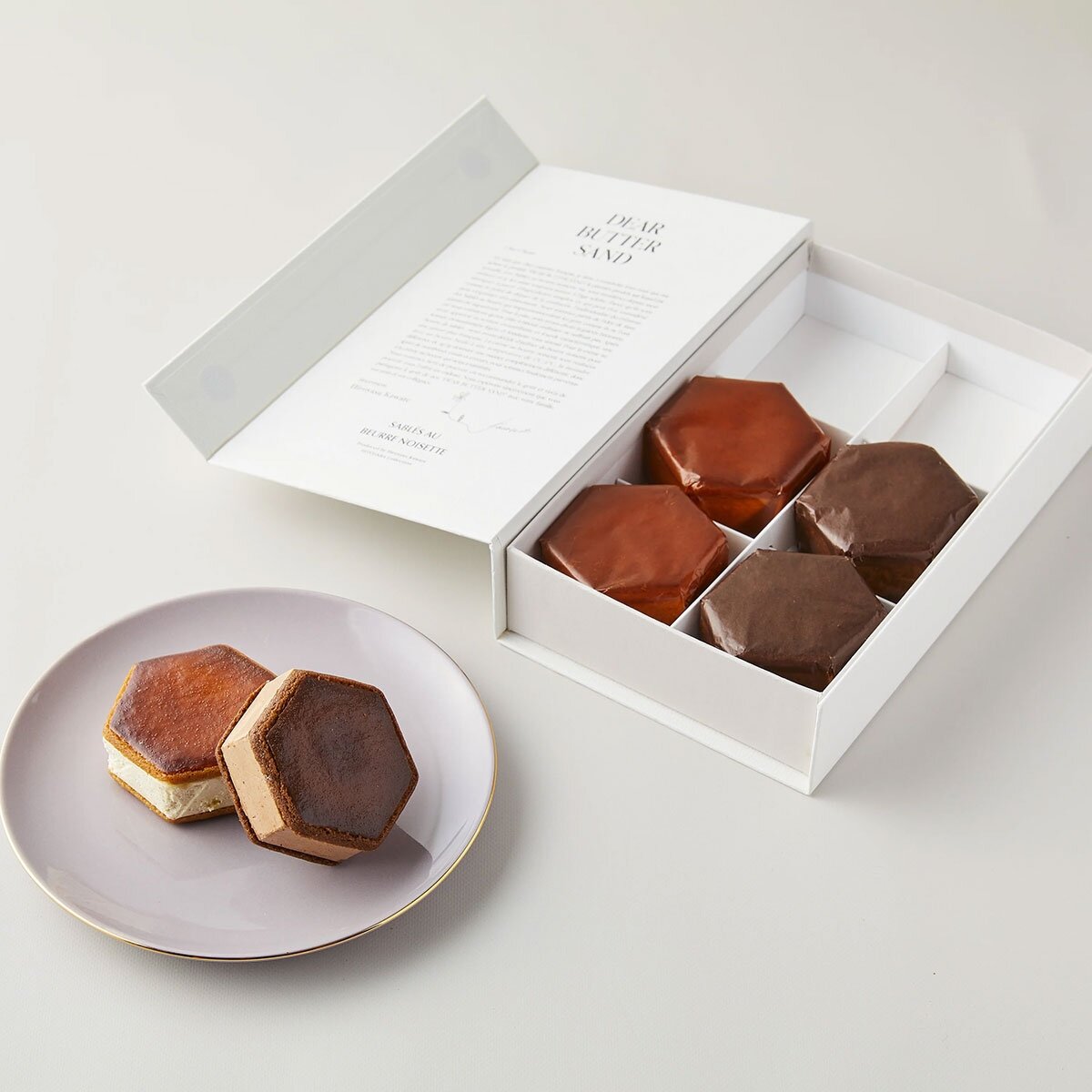 ミシュラン二つ星「フロリレージュ」川手シェフが手掛ける、2種のバターサンドを詰め合わせた特別なアソートセット。焦がしバターの芳醇な香りと口どけを追求したラムレーズンバターサンドには、希少な国産ラム「イエラム サンタマリア ゴールド」を使用。奥深く柔らかな余韻が広がります。ショコラバターサンドは、有機カカオ入りのなめらかなバタークリームに、国産和栗の濃厚なペーストを合わせ、甘さ控えめで上品な味わい。