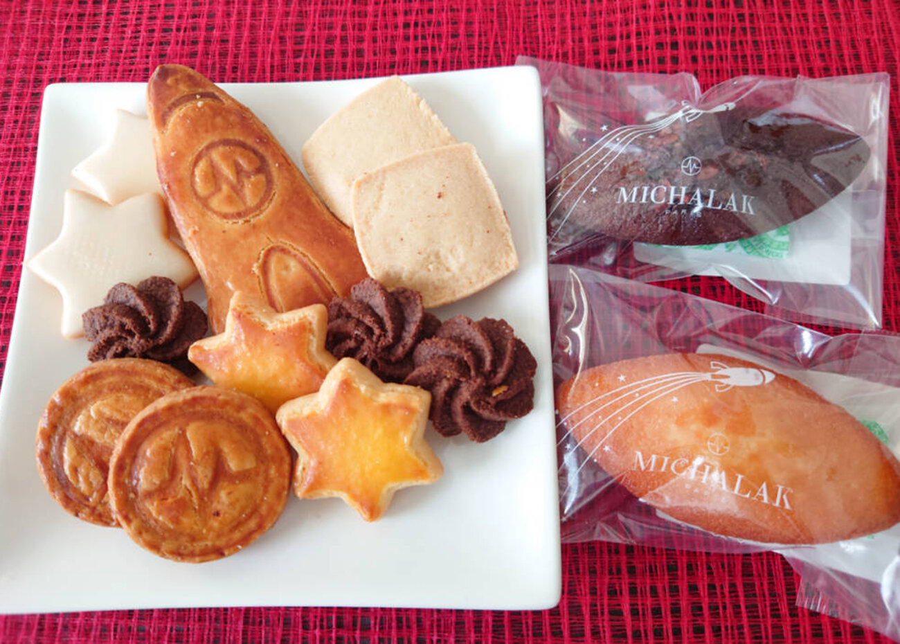 〈MICHALAK〉のアイコンをかたどったビスケット「パルメザン」は、その名の通りチーズを感じる濃厚な味わいで、赤ワインとの相性が抜群です。白い星型「シトロンユズ」は、柚子のアイシングが爽やかなで、スパークリングワインとも相性良し。白のスクエア型はバターとバニラシードの優しい味わい「カレ」。絞りの「カカオ」は、ほろ苦さがフルボディの赤ワインにぴったりです。焼き色の星型は、ほんのりシトロン風味の「ブール」。圧倒的な存在感の「ロケットサブレ」は、バニラと濃厚バターの香りが際立ち、ホットウイスキーと合わせたところ香りがさらに引き立ちましたよ。