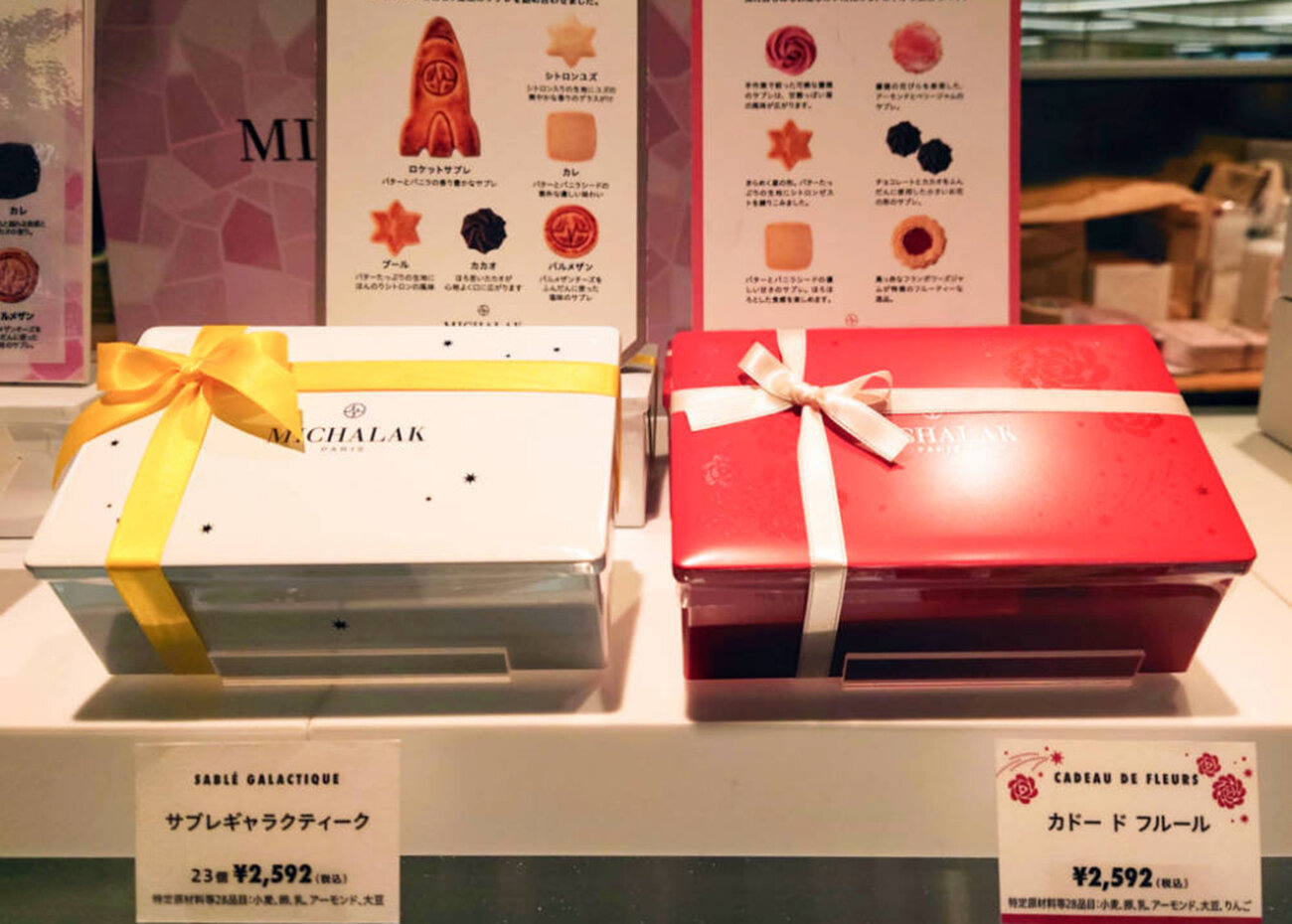 その〈MICHALAK〉を代表するサブレ缶は、お味はもちろん、焼き菓子の一つひとつが、ため息が出るほど美しいデザイン。もらって嬉しいギフトのトップクラスだと感じています。写真左の白い缶が、「サブレギャラクティーク」。赤い缶の方は「カドー ド フルール」です。