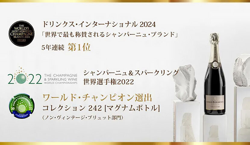 現在でも不動の地位を築いているルイ・ロデレールですが、近年でもその実力は高く評価されています。イギリスの名誉ある専門誌「ドリンクス・インターナショナル」が選ぶ「世界で最も称賛されたシャンパーニュ・ブランド2024」において、テタンジェ、ヴーヴ・クリコ、アンリオなどの名だたるシャンパーニュメゾンを抑えて5年連続で1位を獲得しています。