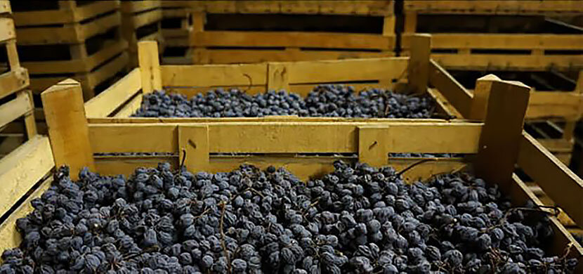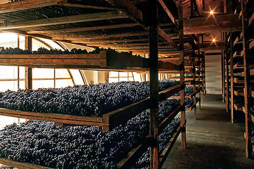 まずは専門の職人が葡萄をすべて手摘みで収穫。一房一房チェックして、少しでも傷があるものは取り除きます。そして専用のすのこに丁寧に並べて、約140日間陰干しをして、じっくりと水分を飛ばして果実味を凝縮させていきます。