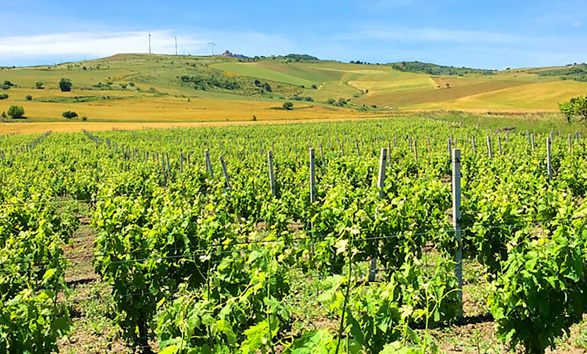 このワイナリー、フェウディ・デル・ヴェスコヴィもまさにその一つ。高品質なワイン造りには「土地、風、太陽」の恵みが必須であることを信条にしています。まず太陽と風について。彼らの葡萄畑は平地ではなく、より太陽が豊かに降り注ぐ丘陵地帯に位置しています。さらに、ヴルトゥーレ山と地中海の両方から夏でも乾燥した涼風が吹いています。こうした自然条件によって、葡萄は病気や害虫に冒されることなく、農薬や除草剤も不使用で、完熟した質の高い葡萄を収穫することができるのです。