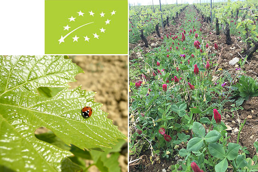 写真 左下・右:昆虫や雑草も葡萄と生存する自然の生態系のオーガニック畑