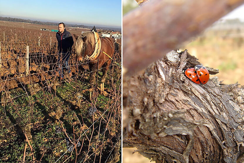 ビオディナミ農法は、化学肥料や農薬を一切使わず、畑は馬で耕作し、月の満ち欠けに従って農作業を行います。葡萄樹と葡萄樹の間には害虫を防ぐハーブを植え、益虫のてんとう虫が害虫を食べることで、防虫剤などの農薬を排除。また牛糞や水晶の粉、イラクサやカモミールなどのハーブの煎じ液を肥料として、畑に与えることで化学肥料を排し、大地を守り葡萄の味わいを最大限に生かしたワイン造りを行っています。