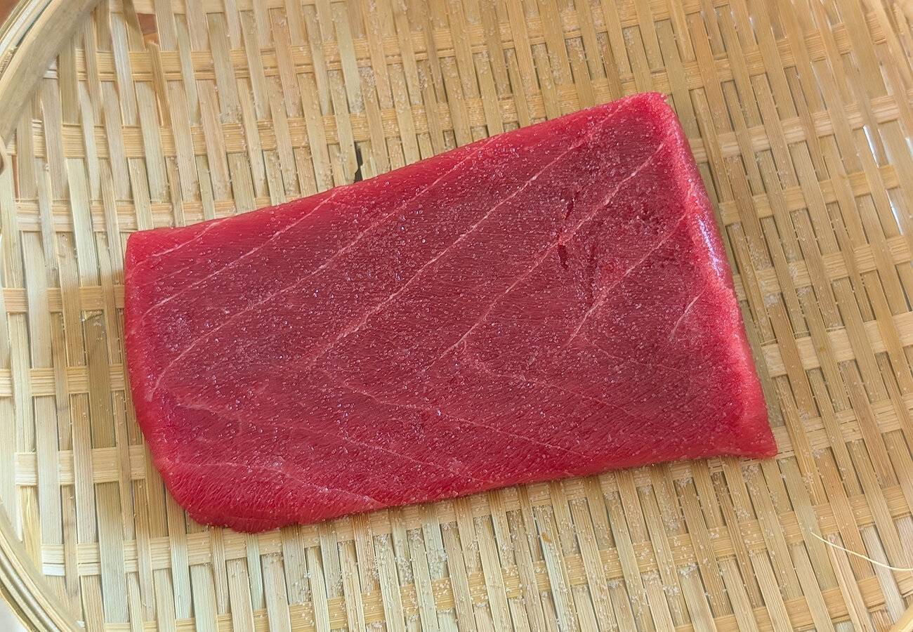 1、マグロはふり塩をし、10分ほどおいたら水分が出てくるので、水で洗い、しっかりとキッチンペーパーで水気をとる。