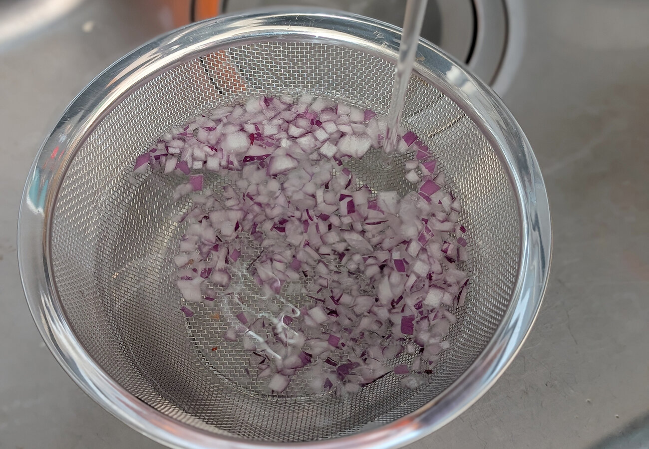 2、マグロを1cm角程度に切る。ケイパーはみじん切りにする。赤玉ねぎはみじん切りにし、水にさらす。水にさらした赤玉ねぎはしっかりと水気を絞る。