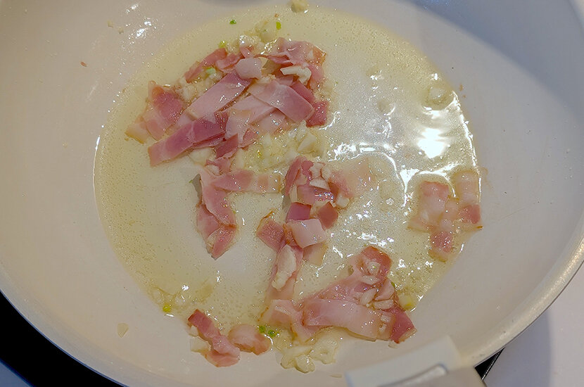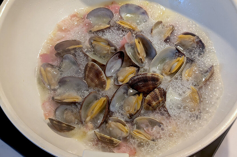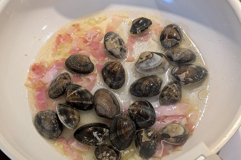 2、フライパンにオリーブオイルをひき、ニンニクを香りが立つまで炒める。ベーコンを炒めたら、アサリと酒を入れ、蓋をし、アサリの殻があくまで蒸す。