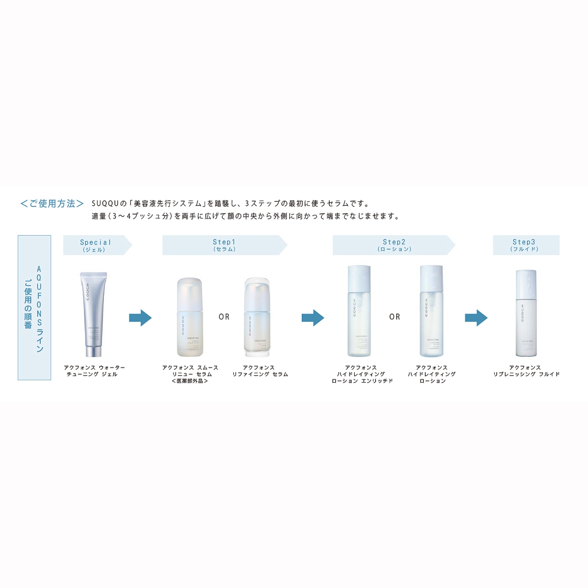 SUQQUの「美容液先行システム」を踏襲した、うるおいを仕込む美容液。肌なじみの良さを追求したテクスチャーによって、肌にのせた瞬間に崩れるように角層まで浸透し、うるおいで満たします。キメを整え、次のステップの化粧水が角層に浸透しやすい肌状態へ整えます。
