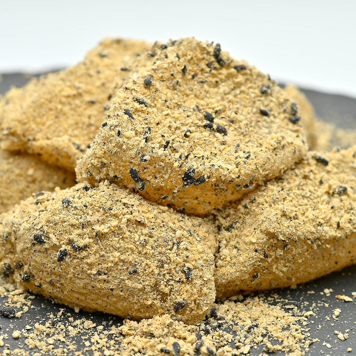 炊きたてのわらび餅を瞬間密封して出来たての美味しさをとじこめました。風味豊かな黒ごまと、黒豆きな粉をブレンドした「黒ごまきな粉」でお召し上がりください。