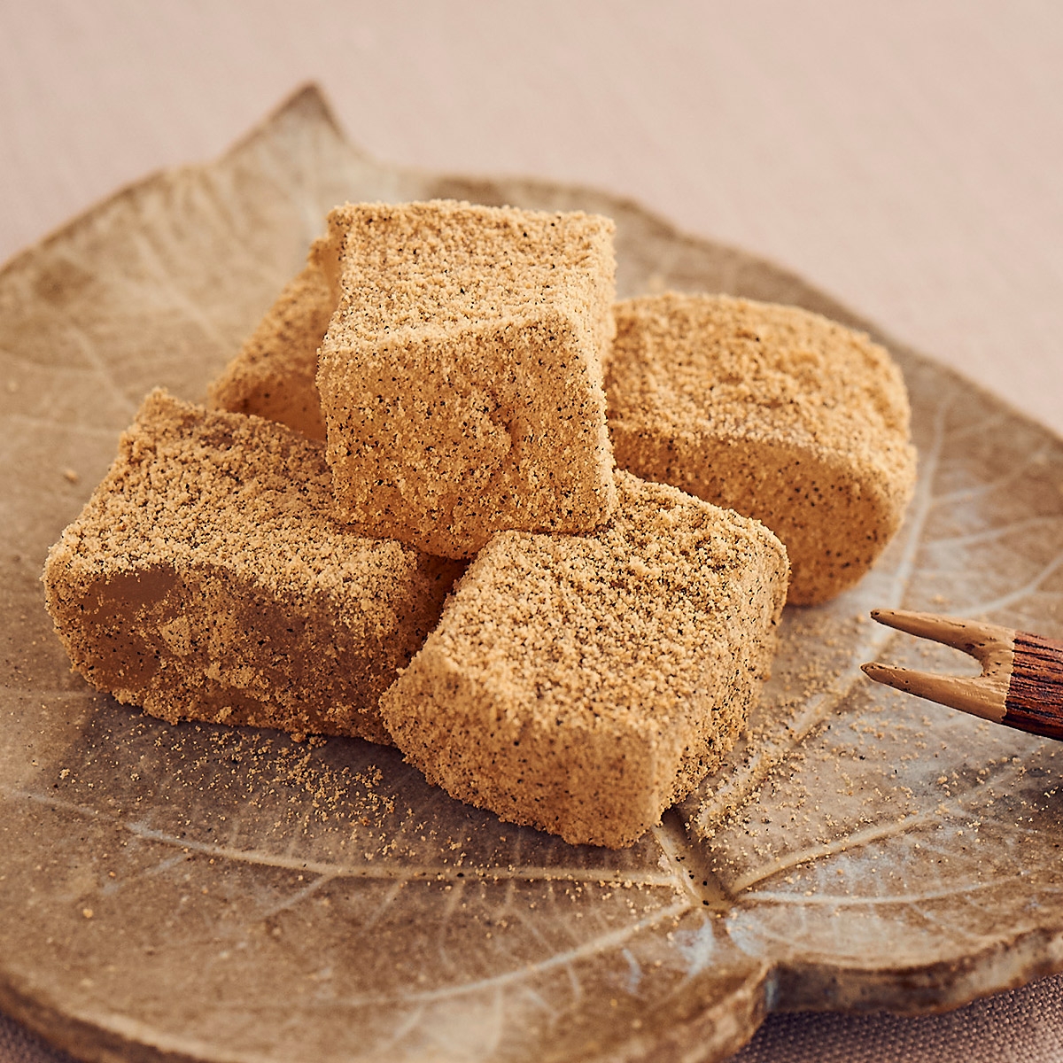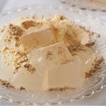 極上の丹波黒豆きな粉を石臼で挽いたきな粉で味わうお味はまさに味・香り絶品!芭蕉堂の看板商品「笑来美餅(わらびもち)」です。