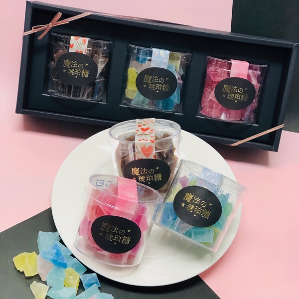 魔法の琥珀糖の一番人気フレーバー「プレーン」と、期間限定の「チョコ」「ラズベリー」の3種をセットにしたBOX。ギフトにも喜ばれること間違いなし。