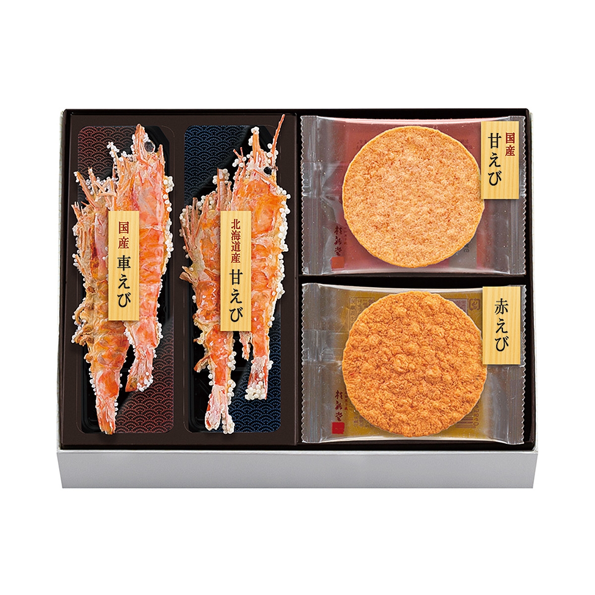 2カップと6袋入(車えび姿焼き×1カップ、甘えび姿焼き×1カップ、甘えび炙り焼き×3袋、赤えび炙り焼き×3袋)