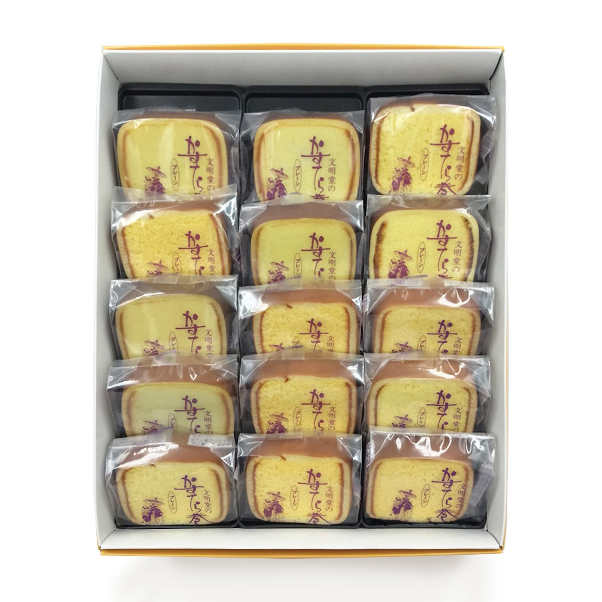 しっとり焼き上げたカステラを三笠山の皮で包みました。手軽にお召し上がりいただけるよう個包装になっているのも人気の秘密。ちょっとした手土産などにご利用くださいませ。