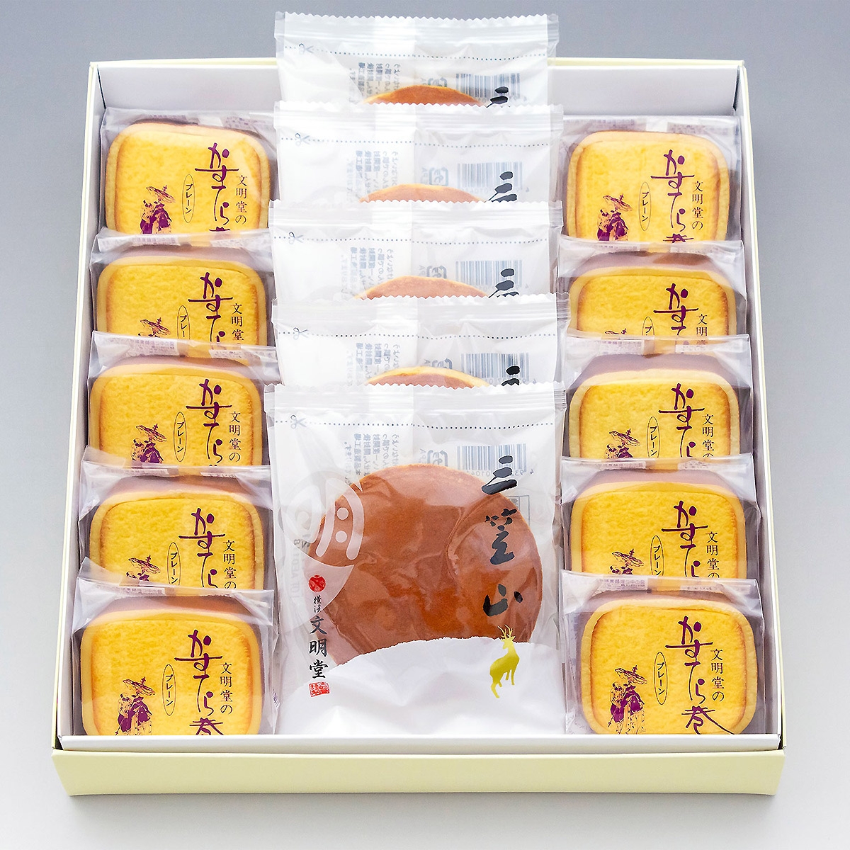 北海道産の小豆を用いた特製つぶし餡を、上品に焼き上げた皮で合わせた三笠山と、しっとりと焼き上げたカステラを三笠山の皮で包んだかすてら巻きを詰合せました。2つの違ったお味が楽しめる人気の商品です。