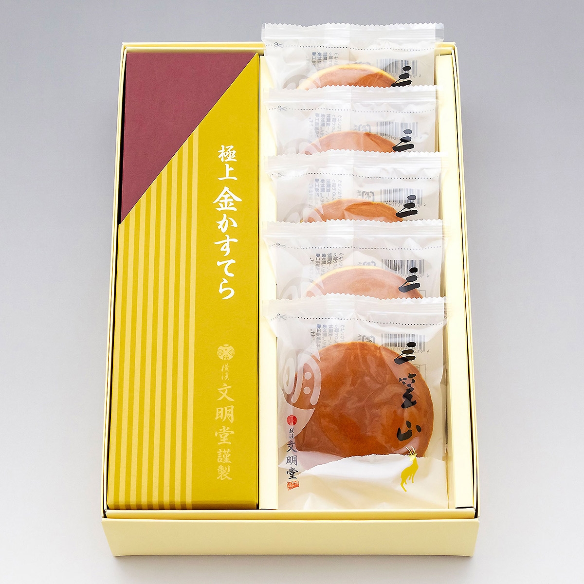 卵黄をたっぷりと使用して和三盆糖を加え、しっとりとコクのある「極上金かすてら」と、文明堂を代表する銘菓「三笠山」の詰合せです。