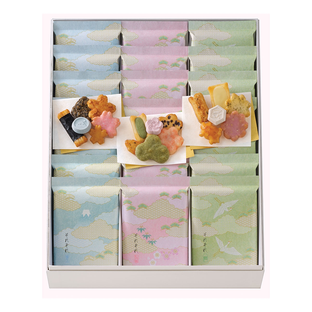「富士」「松竹梅」「鶴」の色鮮やかなパッケージに、味や形を楽しめるバラエティー豊かなおかきを詰め合わせました。召し上がっていただいたみなさまそれぞれが幸せでありますようにという願いをこめております。