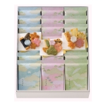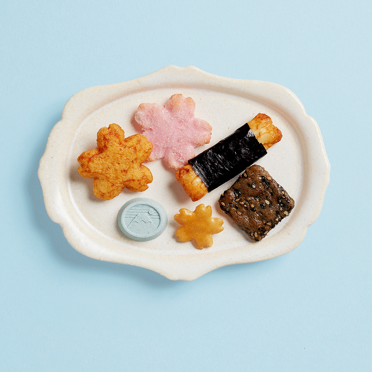 日本の象徴である「富士」、日本の花「桜」や日本の味「海苔」・「醤油」のおかきを組み合わせました。富士山の末広がりの形は、幸福の広がりや繁栄が続くという象徴であり、明るい未来への願いが込められています。