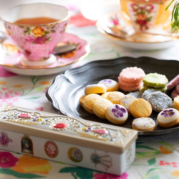 「目にもご馳走」ふたを開けるとそこにはいろとりどりのかわいいクッキー。一面に咲く花をイメージして一枚一枚丁寧に焼き上げました。お口に入れる前に少しの間、目でも味わってください。