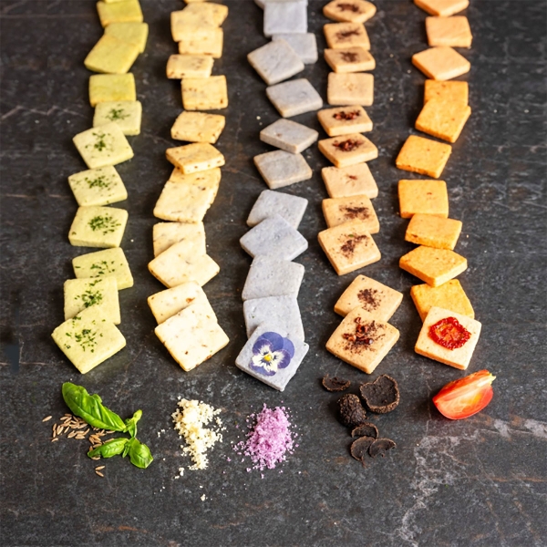 トマトピンクペッパー4枚、すみれ塩4枚、カカオトリュフ4枚、グリーンカレー4枚、フロマージュオニオン4枚