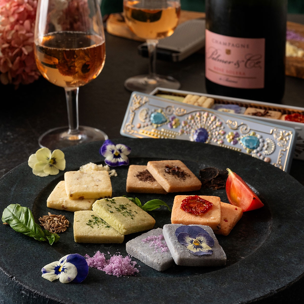 フレンチレストランの発想が息づく、厳選された食材のマリアージュ。発酵バター香るリッチなクッキーサレ(塩味)は、まるで一皿の料理。5つの個性豊かなセレクションは、お酒にもあうフィンガーフードです。