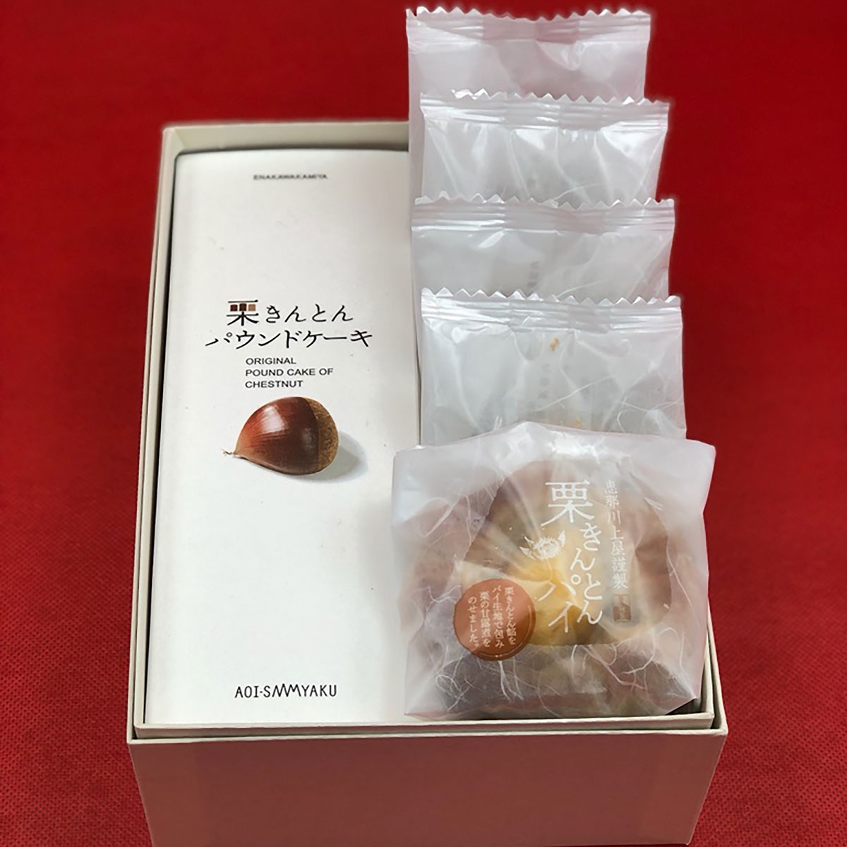 栗を贅沢に使用したオリジナルパウンド「栗きんとんパウンドケーキ」と、栗をふんだんに使った恵那川上屋特製の「栗きんとんパイ」の詰合せです。