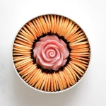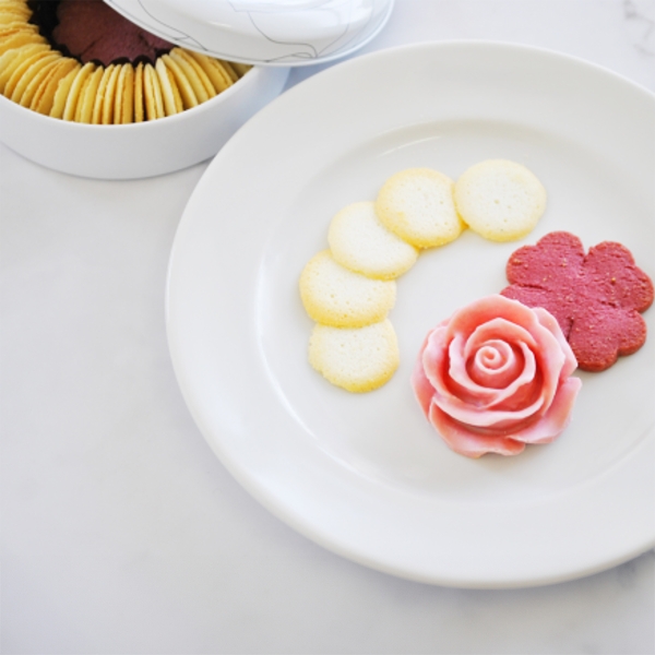 ラングドシャは北海道産の生クリームを使用し、ミルキーで口の中で溶けるやさしい食感に仕上げ、フランス産のチョコを使用した美しいバラの花で飾りました。
