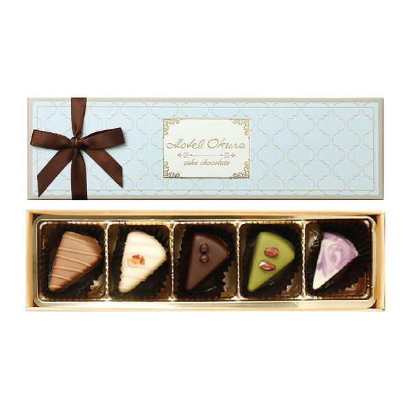 ケーキの形をしたショコラ詰め合わせ。苺ショートケーキ風、抹茶ティラミス風、マロンケーキ風、ブルーベリーチーズケーキ風、オペラケーキ風、5種類の味をお楽しみいただけます。