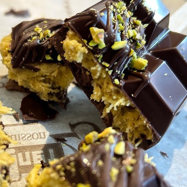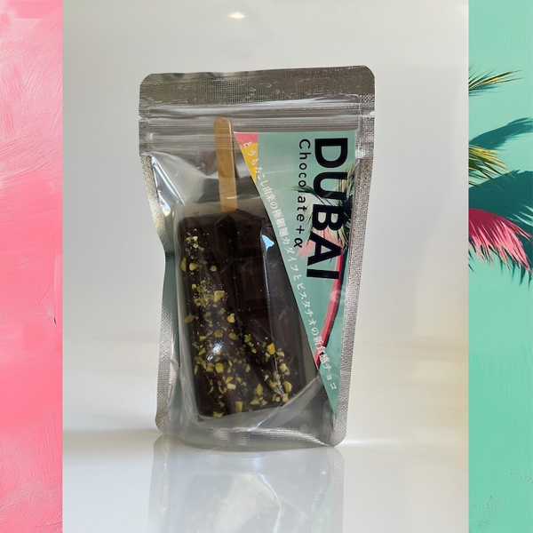 スティックドバイチョコ。ザクザク食感トルコ生まれのとうもろこし由来の極細麺「カダイフ」と自家製焼き立てのピスタチオから作るペーストが入ったチョコレートです。チョコの中から溢れ出すピスタチオのグリーンにコーティングされた極細麺のインパクトと美味しさから中東ドバイ発、韓国経由で、2024年にTikTokを中心に日本の若者の間でも話題になっています。