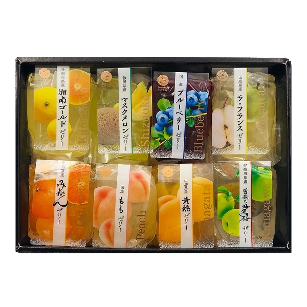 湘南ゴールドゼリー170g、山形県産黄桃ゼリー180g、ブルーベリーゼリー180g、みかんゼリー180g、静岡県産マスクメロンゼリー170g、国産ももゼリー180g、山形県産ラ・フランスゼリー180g、曽我の梅ゼリー180g 各1