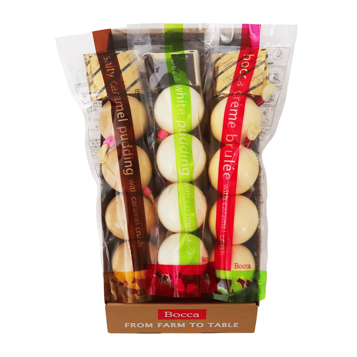 牧家の白いプリン4個入320g×1、牧家のクレームブリュレ4個入308g×1、牧家の塩キャラメルプリン4個入308g×1