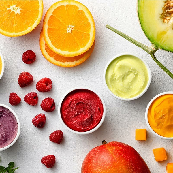 見た目も鮮やかで口の中で溶け出すシャーベットは、果汁そのものに感じてしまうほど。静岡県産のマスクメロンを筆頭に、それぞれのフルーツの風味、味わいを惜しげもなく活かしました。