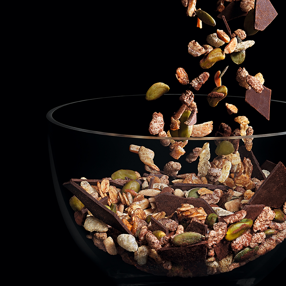 口に入れるたびに楽しげな音が軽快に響く中、フルール・ド・セル入りチョコレート片が全体の味覚を力強く盛り上げています。牛乳をさっとかけて、驚きに満ちた朝食をお楽しみください。