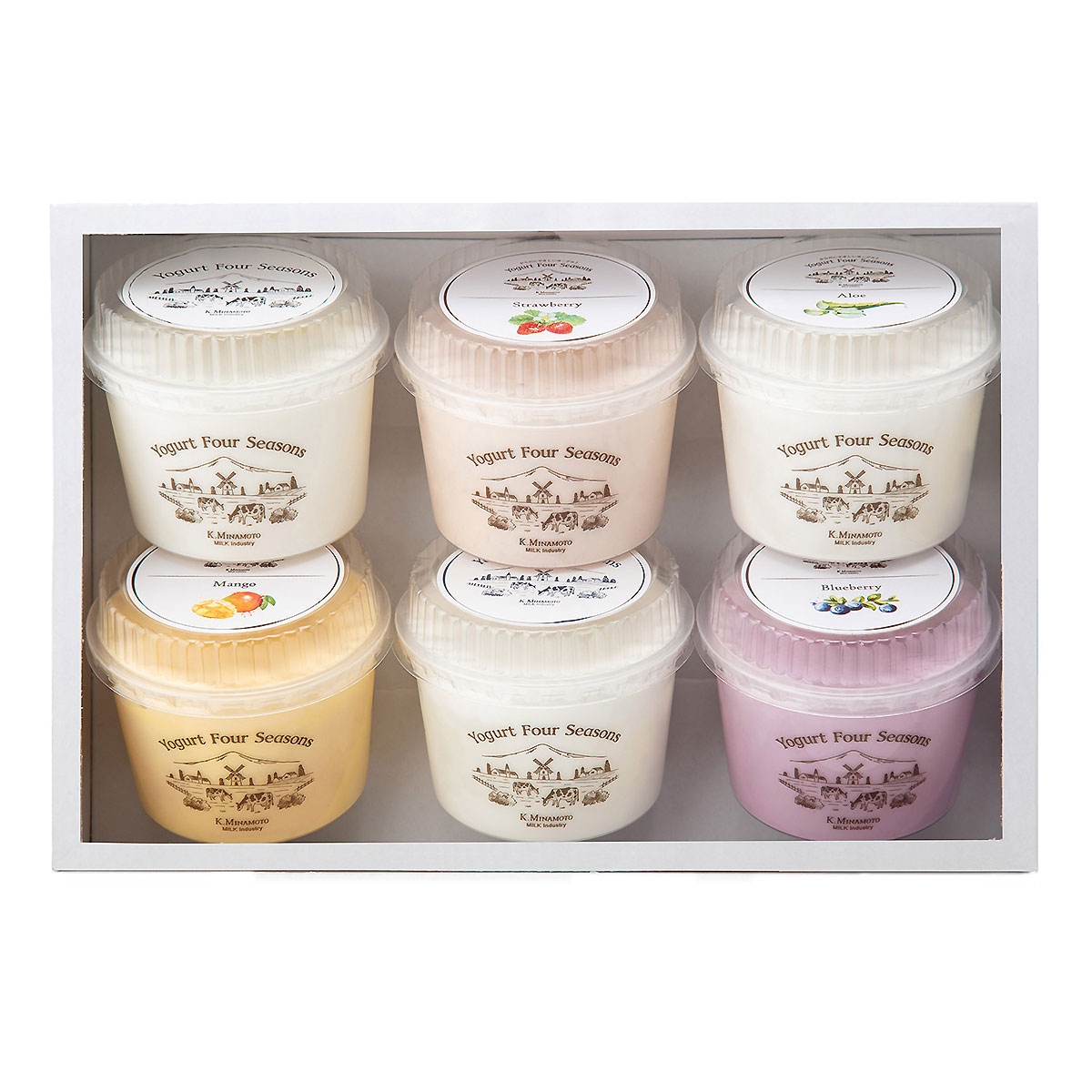 ナチュレヨーグルト プレーン加糖、プレーン砂糖不使用、フルーツヨーグルト(イチゴ、マンゴー、ブルーベリー、アロエ)各1