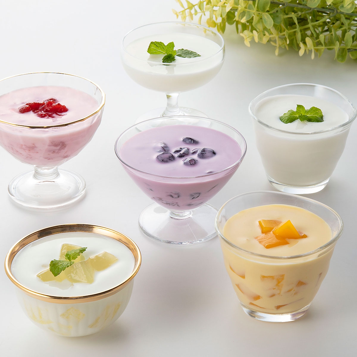 ナチュレヨーグルト プレーン加糖2、プレーン砂糖不使用、フルーツヨーグルト(イチゴ2、マンゴー2、ブルーベリー1、アロエ1)
