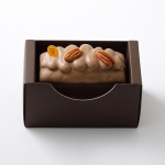 ピーカンナッツ風味のパウンドケーキ、ピーカンナッツ入りプラリネフィユテ、ピーカンナッツ入りプラリネクリーム(ブロンドチョコレートコーティング)