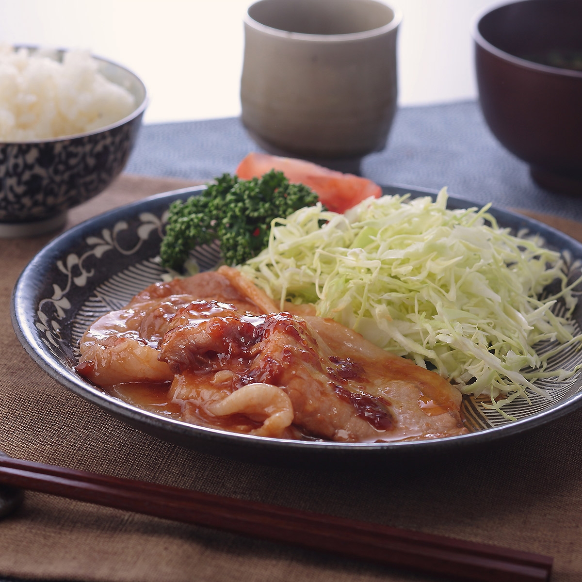 鹿児島県産の黒豚は甘みのある柔らかな肉質でさっぱりとした脂と肉の旨みが味わえます。きめ細かく良質で軟らかいロース肉を独自ブレンドの生姜焼きのタレで絡めました。甘辛のタレがご飯にもキャベツにも合います。