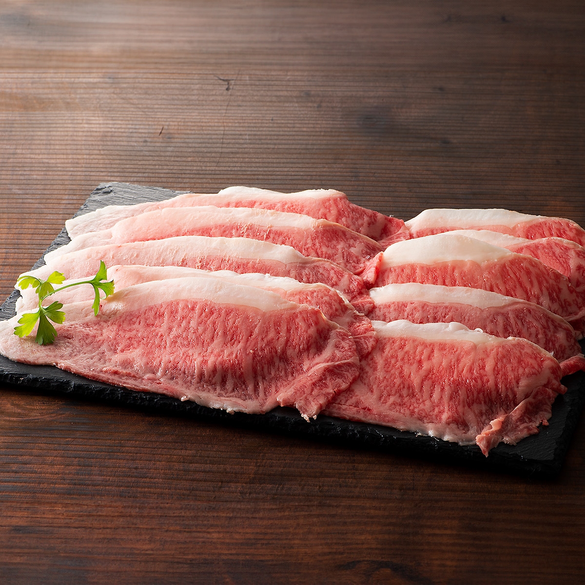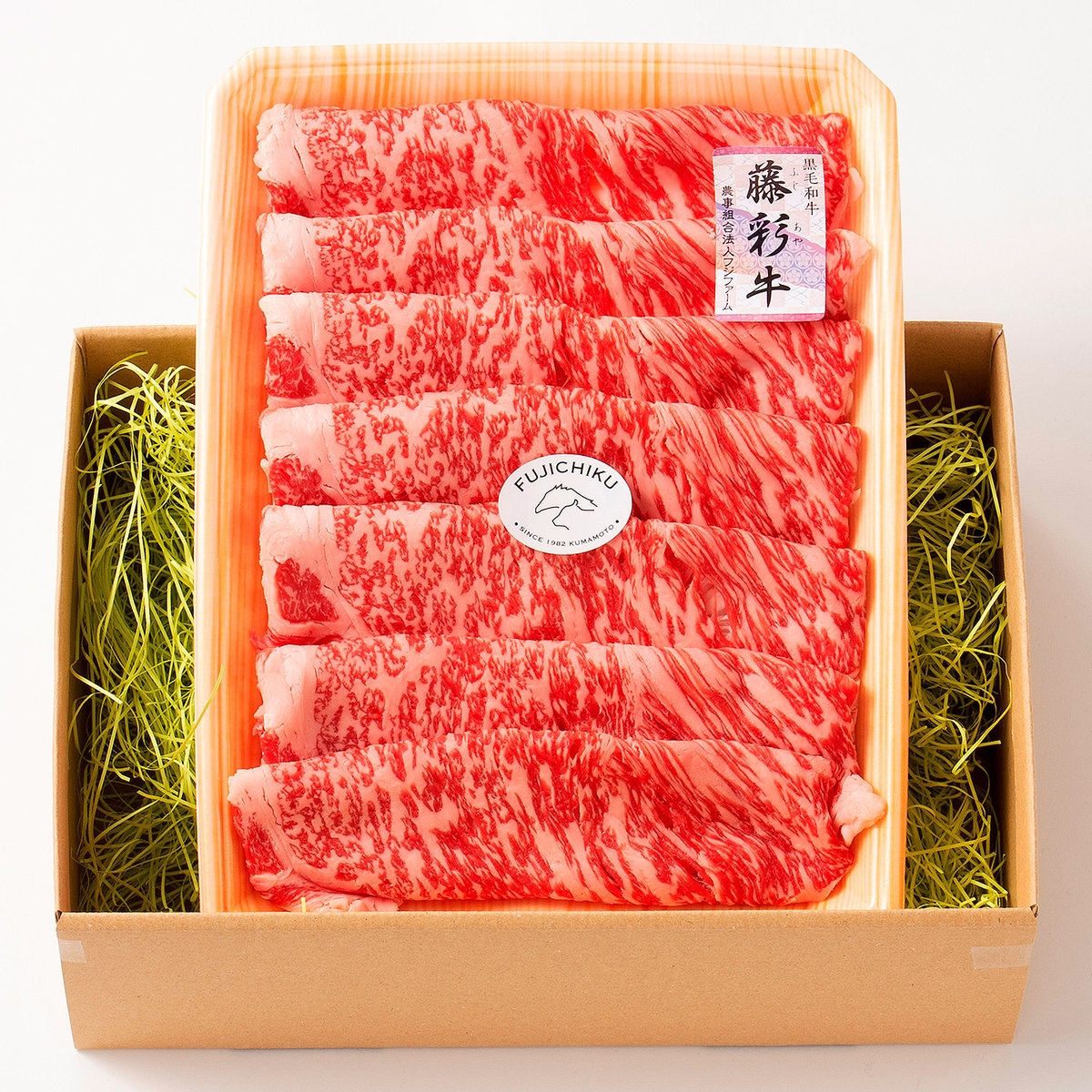 黒毛和牛の専門店<フジチク>の独自ブランド黒毛和牛<藤彩牛>。赤身とサシのバランスが良く、柔らかい肉質が特徴です。ロースは肉質が特に柔らかく旨みが強い部位です。そのお肉を職人が薄く丁寧にスライスしました。薄くスライスされたお肉はすき焼きやしゃぶしゃぶに適しています。