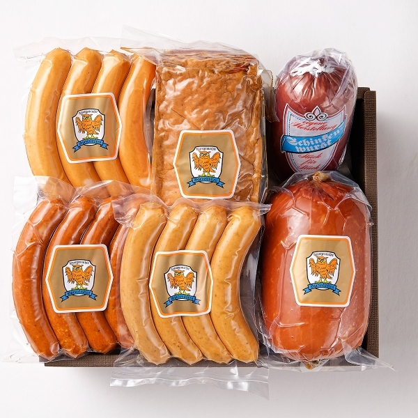 ドイツのハムと同じ製法で造られたボンレスハム「ハウスシンケン」、スライスしてお召し上がりになる「フライシュケーゼ」、「シンケンブルスト」、温めてお召し上がりになると美味しい「オリジナルウィンナー」、「プェルツァー」、「デプレチーナー」の詰合せ