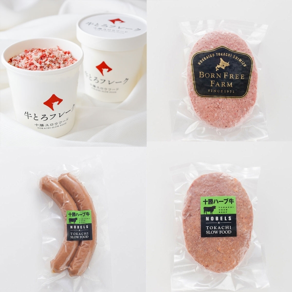 牛とろフレーク(180g)×1個、牛とろプレミアムハンバーグ(150g)×2個、まるトマハンバーグ(150g)×2個、まるトマソーセージ(120g)×1個