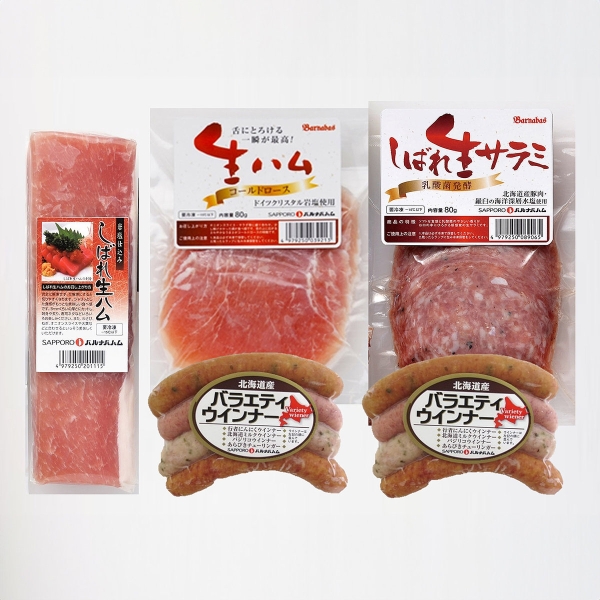 新感覚!うす塩仕立てで厚切りで刺身風に食べると美味しい<しばれ生ハム冊取>と、そのスライス<コールドロース(しばれ生ハム)>、北海道産豚肉原料を乳酸菌発酵で仕上げた<しばれ生サラミ>、北海道産豚肉と天然羊腸でパリッとジューシーに仕上げた<北海道産バラエティ4種>のバラエティ豊かなセットです。