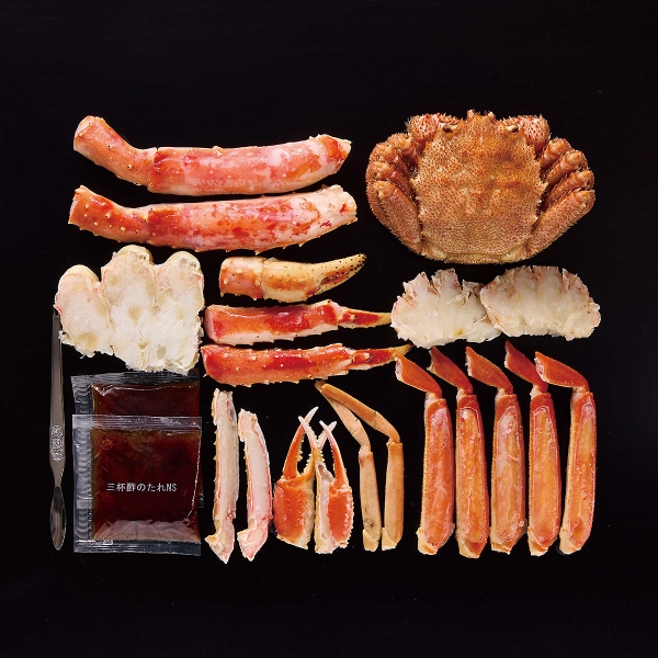 ボイルたらばがに(カット)400g、ボイルずわいがに(カット)300g、ボイル毛蟹1尾330g、三杯酢、蟹フォーク