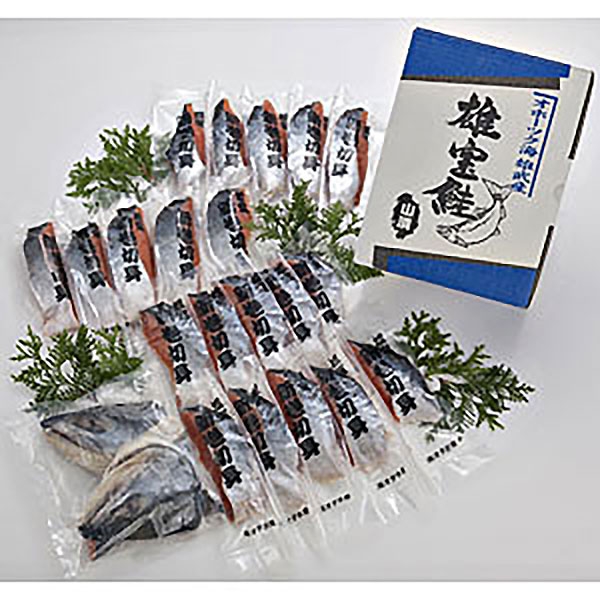 北海道オホーツク海の雄武町に水揚げされた秋鮭で、銀毛と呼ばれる選別をされた中から3kg以上のものをブランド名「雄宝」と呼んでいます。脂ののった「雄宝」に1尾ずつ丁寧に塩をまぶし山のように積み重ね定期的に上下を入れ替えながら4日間山漬してから、低温庫で熟成させたのち姿切身にして1切ずつ個包装にしました。鮭本来の旨みが身にギュッと凝縮された、本当にうまい鮭です。