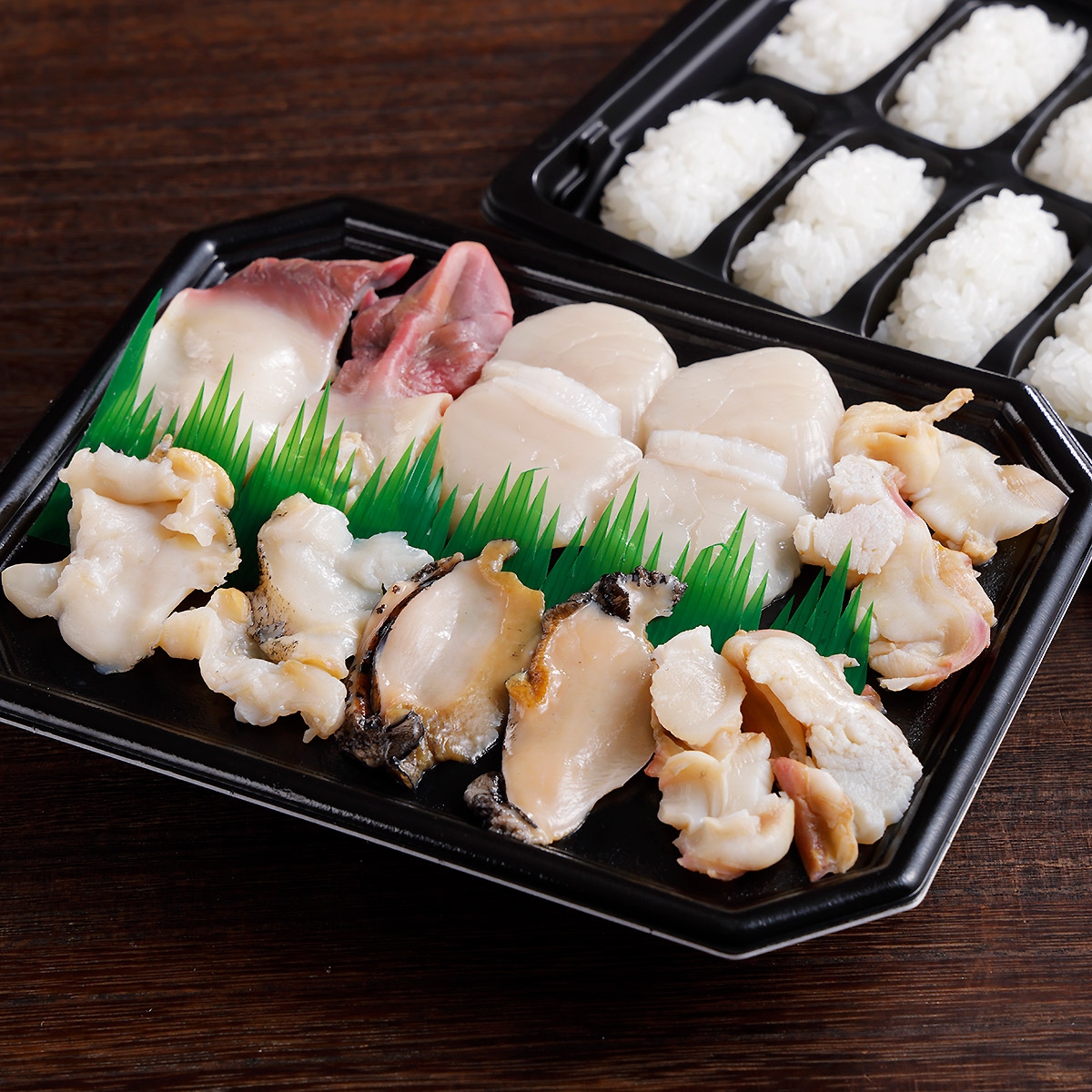 貝づくし凍眠寿司種セット あわび(8g)、ほっき(10g)、ほっきみみ(8g)、つぶ(8g)、 ほたて(18g)、シャリ10貫付き(180g)