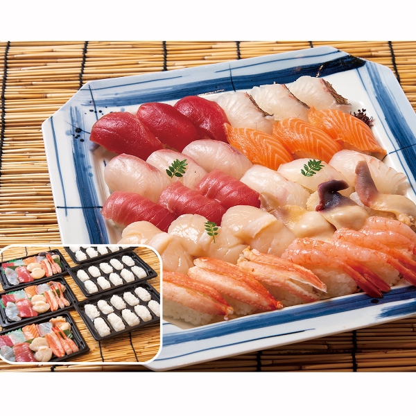 本鮪赤身(15g)、ゆず〆真鯛(15g)、活〆かんぱち(15g)、サーモン(15g)、本鮪中とろ(15g)、活〆平目(15g)、ほたて(18g)、ほっき(10g)、ズワイガニ(11g)、南蛮えび(14g)、シャリ10貫付き(180g) 各3個