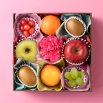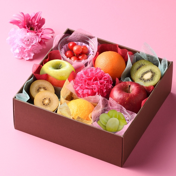さくらんぼ・りんご・オレンジ・キウイ・ぶどう・日向夏などの季節の柑橘…、8種類の果物を宝石箱に見立てて詰合せました。中央にはカーネーションのお花(造花)を。見て楽しく、食べておいしい母の日ギフトです。