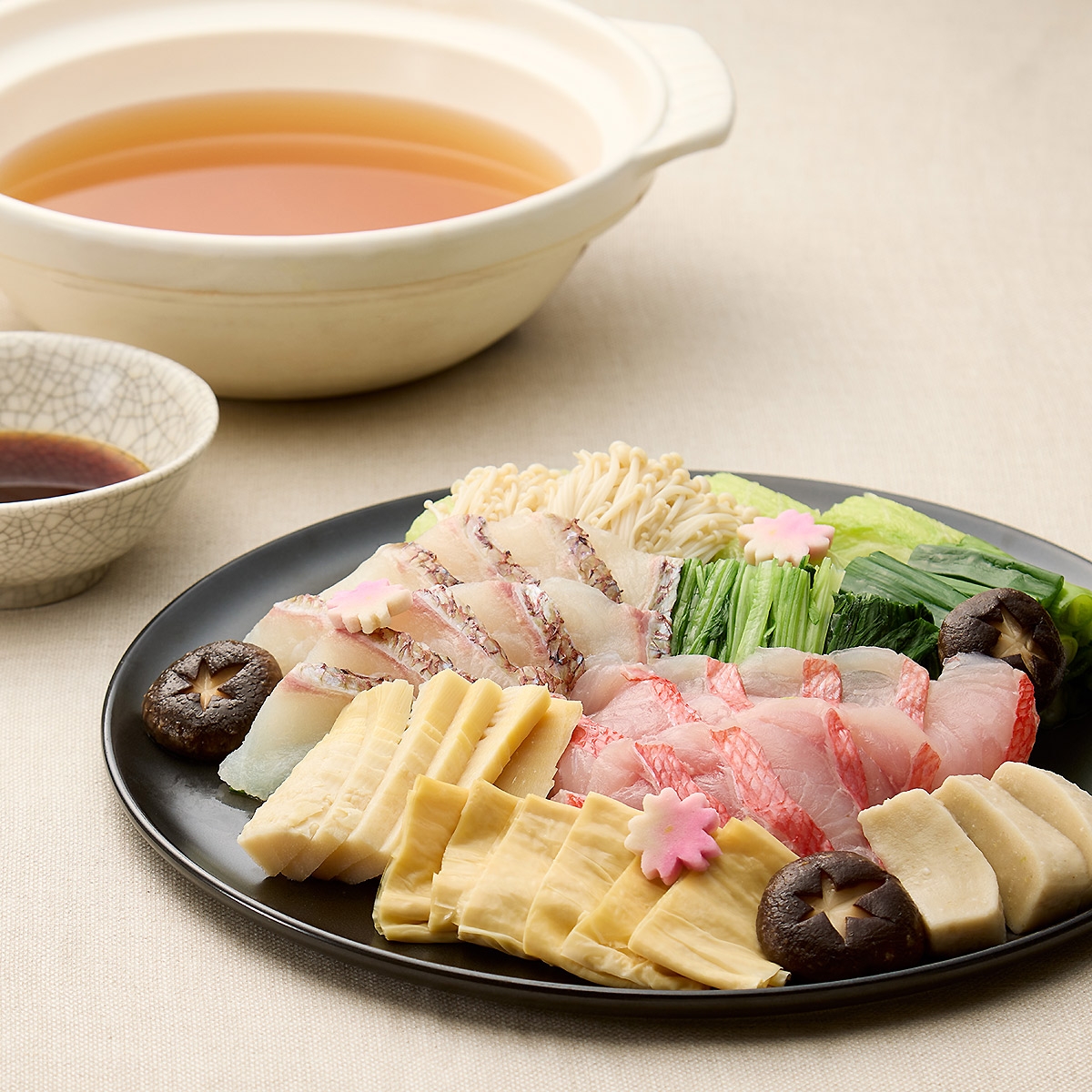 (2~3人前)鯛、金目鯛、白菜、九条葱、椎茸、壬生菜、えのき、花麩、湯葉、粟麩、京筍、出汁、ポン酢